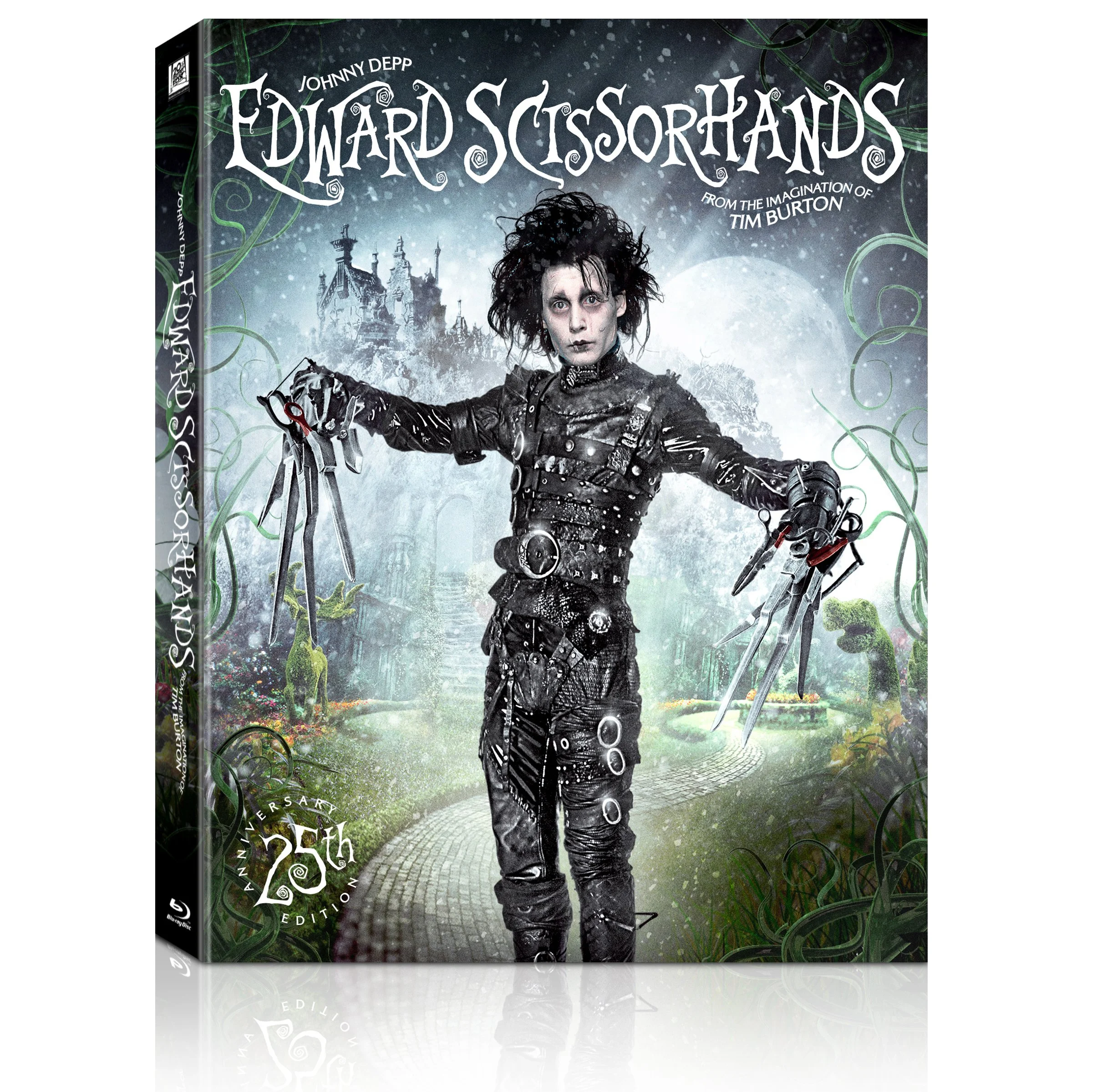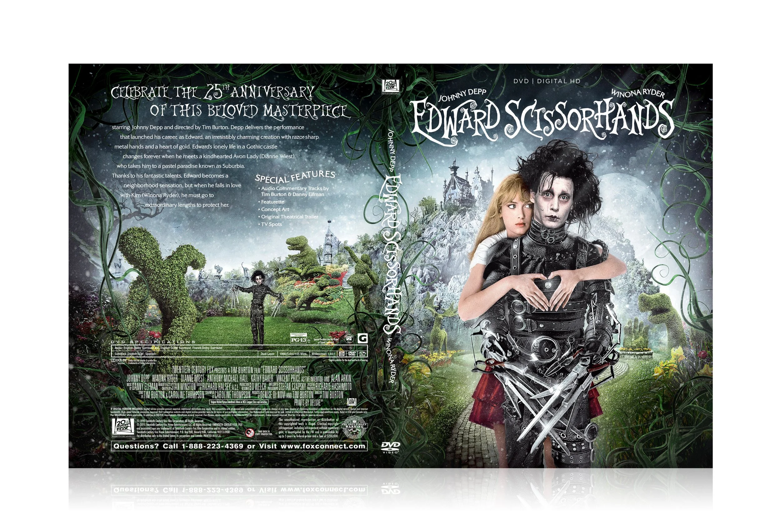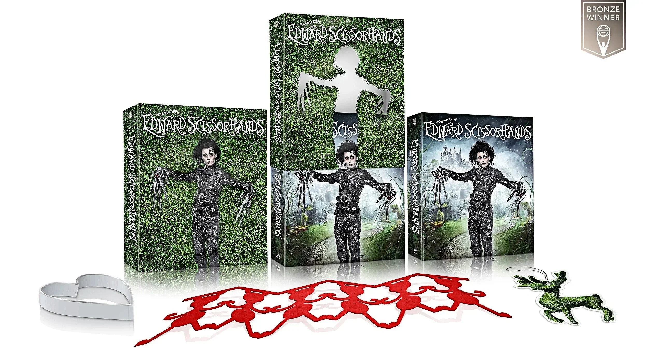 We developed a clear slipcover printed with a topiary silhouette shaped like Edward’s profile, revealing the full garden scene beneath when removed, extending the film’s visual motif into a tactile packaging experience.