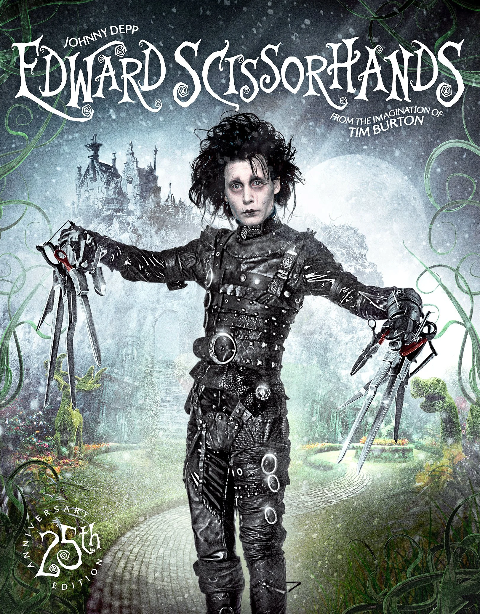 The anniversary key art centers on Edward and Kim in a romantic pose within Edward’s topiary garden, paired with an alternate solo portrait of Edward that emphasizes the character’s quiet isolation.