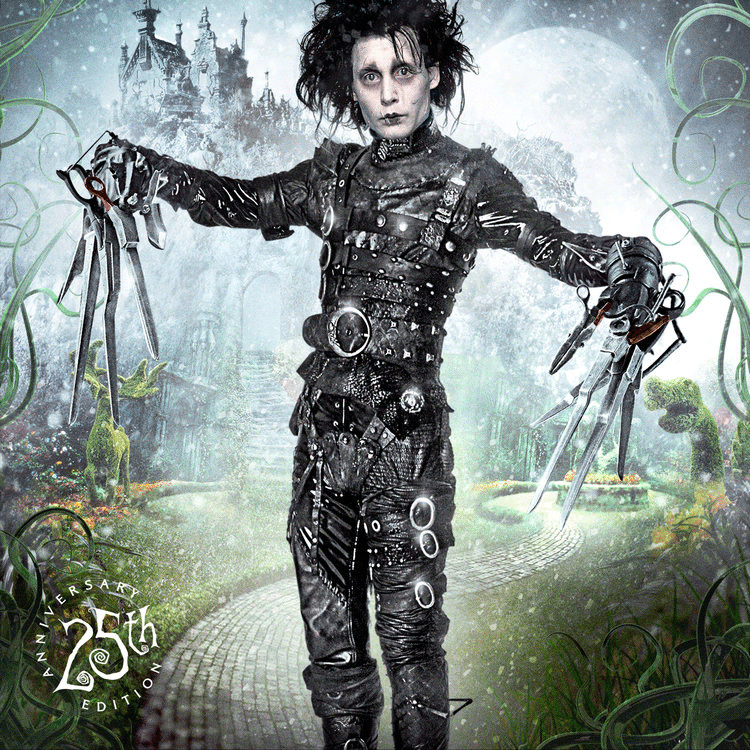 Edward Scissorhands is an American fantasy romance film directed by Tim Burton. Johnny Depp plays an artificial humanoid named Edward, an unfinished creation who has scissor blades instead of hands. The young man is taken in by a suburban family and falls in love with their teenage daughter Kim (Winona Ryder). This key art was created for the film’s 25th anniversary, to be featured on streaming apps and DVD packaging.
